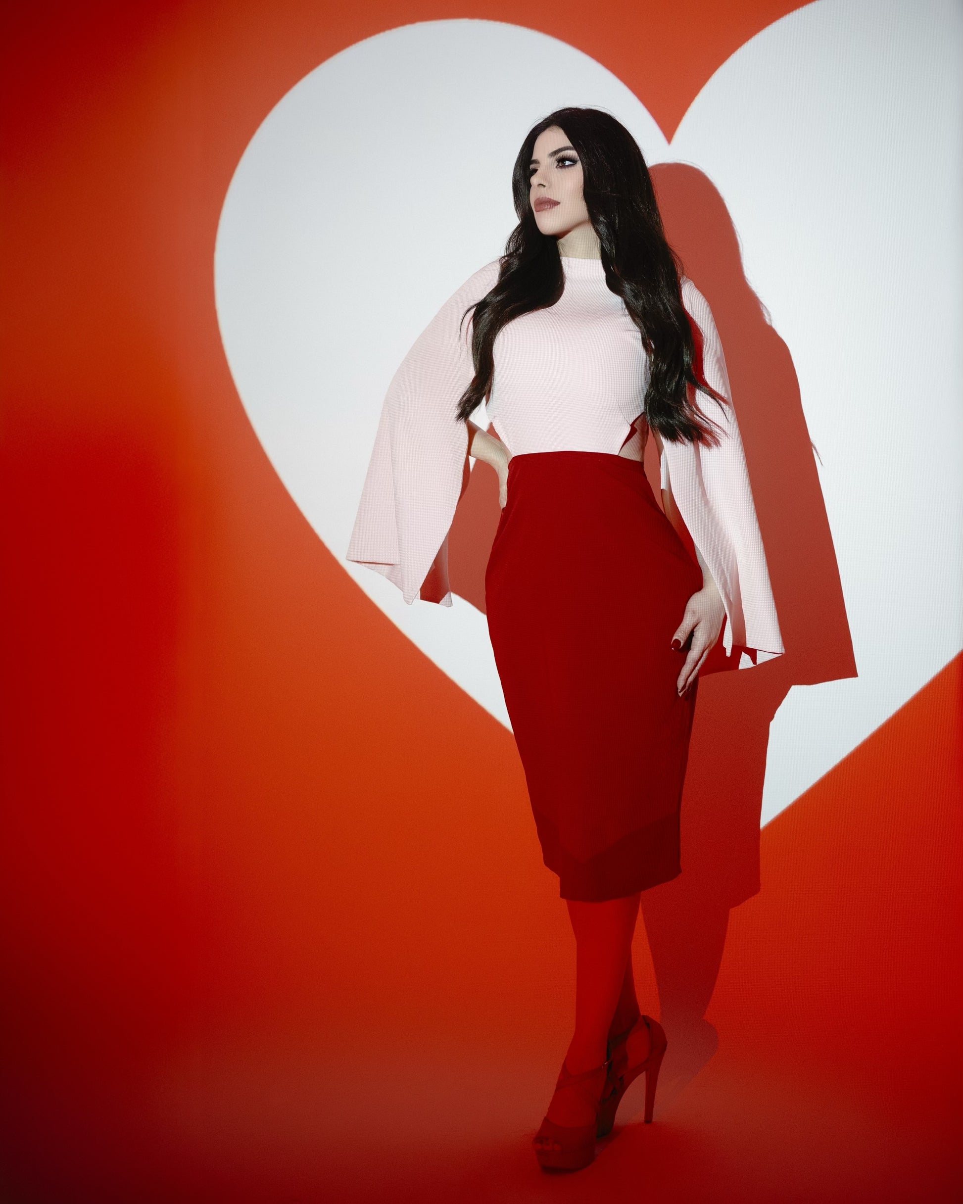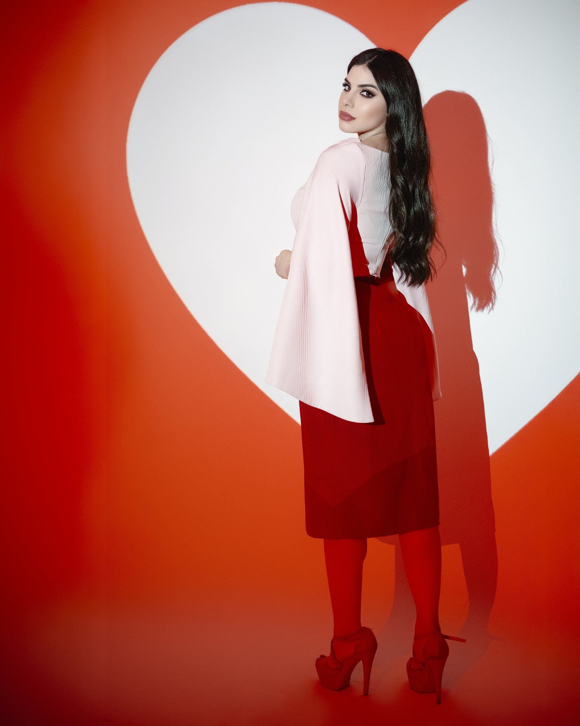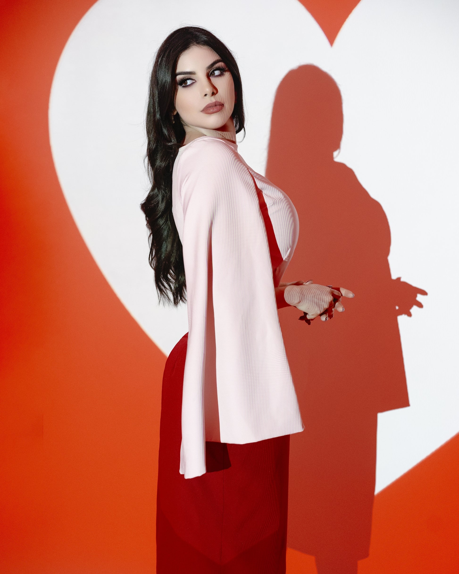 Elegante diseño en rosa y rojo carmesí, con mangas amplias y falda recta que estiliza la silueta. Ideal para eventos especiales.